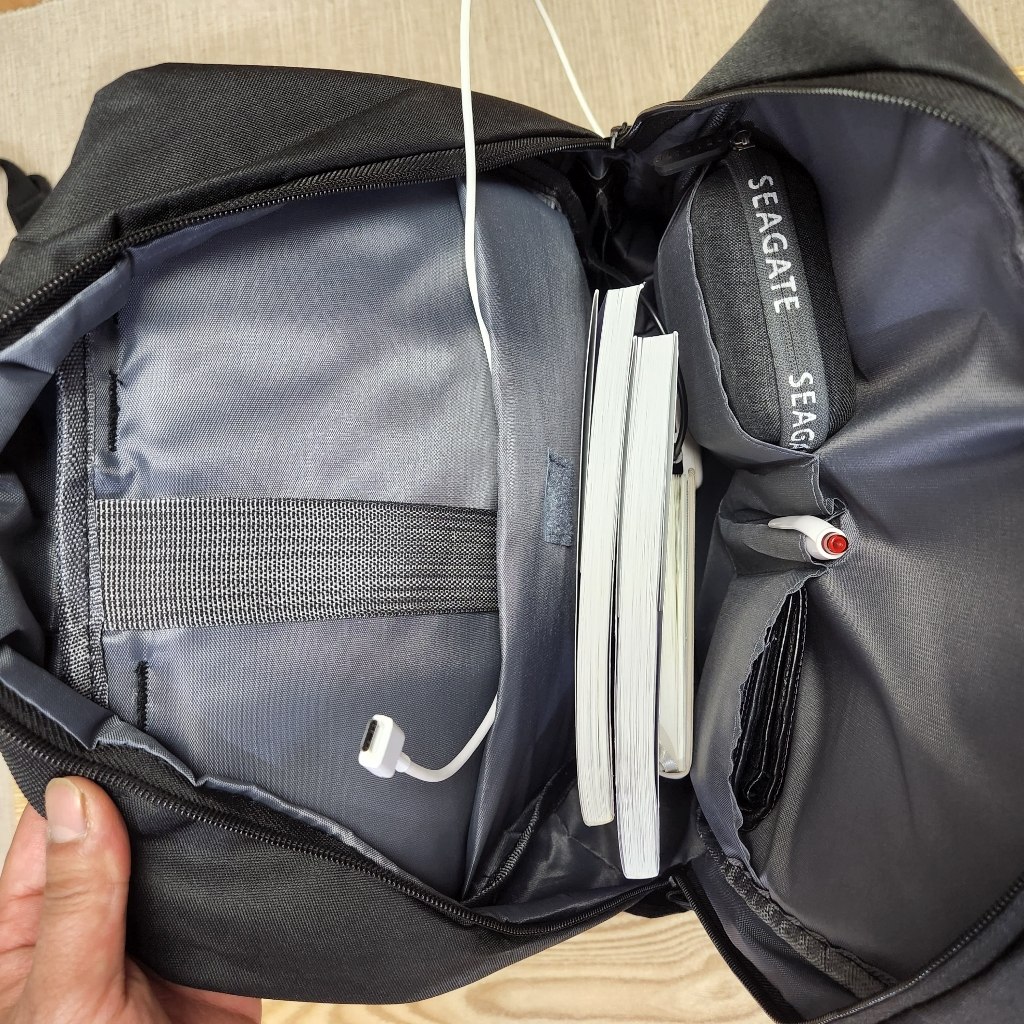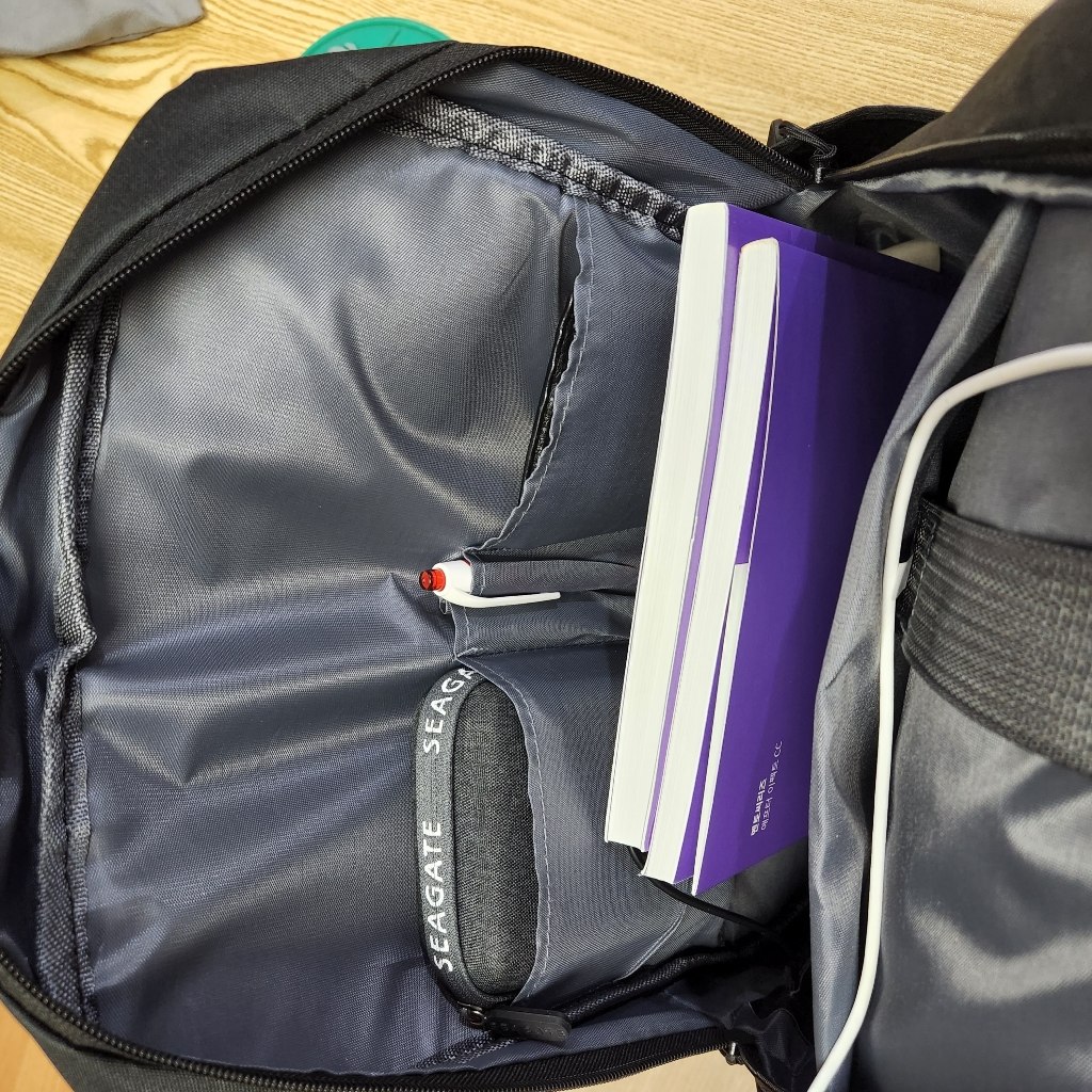 가방 내부와 주머니들을 보자면 구획은 기본 구성의 구획을 나눠 기본에 충실한 점이 좋았다. 다만 지갑 수납하는 공간은 조금 부족하지 않았나 느끼는데 이 가방의 대부분 구매자는 남자들이고 지갑이 영수증으로 뚱뚱한 경우가 있을 수 있다. 그런데 들어가기앤 좀 작은 크기라 아쉬웠다.