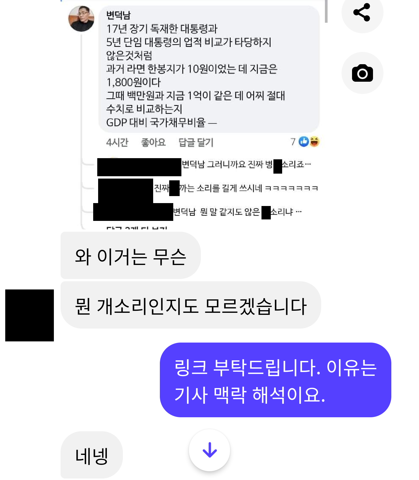 내가 변덕남이라면 위 기사에서 먼저 국가의 돈이니 세금 문제를 먼저 떠올렸을 것이다. 그리고 문재인이 만드는 빚, 인플레이션은 자연스럽게 발생한다는 상식을 합친다. 인플레이션의 원래 특성, 그리고 비판할만한 보수단체, 언론, 정치인을 물색한다. 이렇게 문장을 만들기 전 구상은 끝났다. 최종적으로 작성할 댓글의 내용은 '문재인이 아닌 인플레이션의 영향으로 금융가격이 변하지만 보수(단체, 언론 등)는 이를 무시한다' 정도로 생각해볼 수 있다. 문장 작성은 항상 강조해왔으니 생락한다.