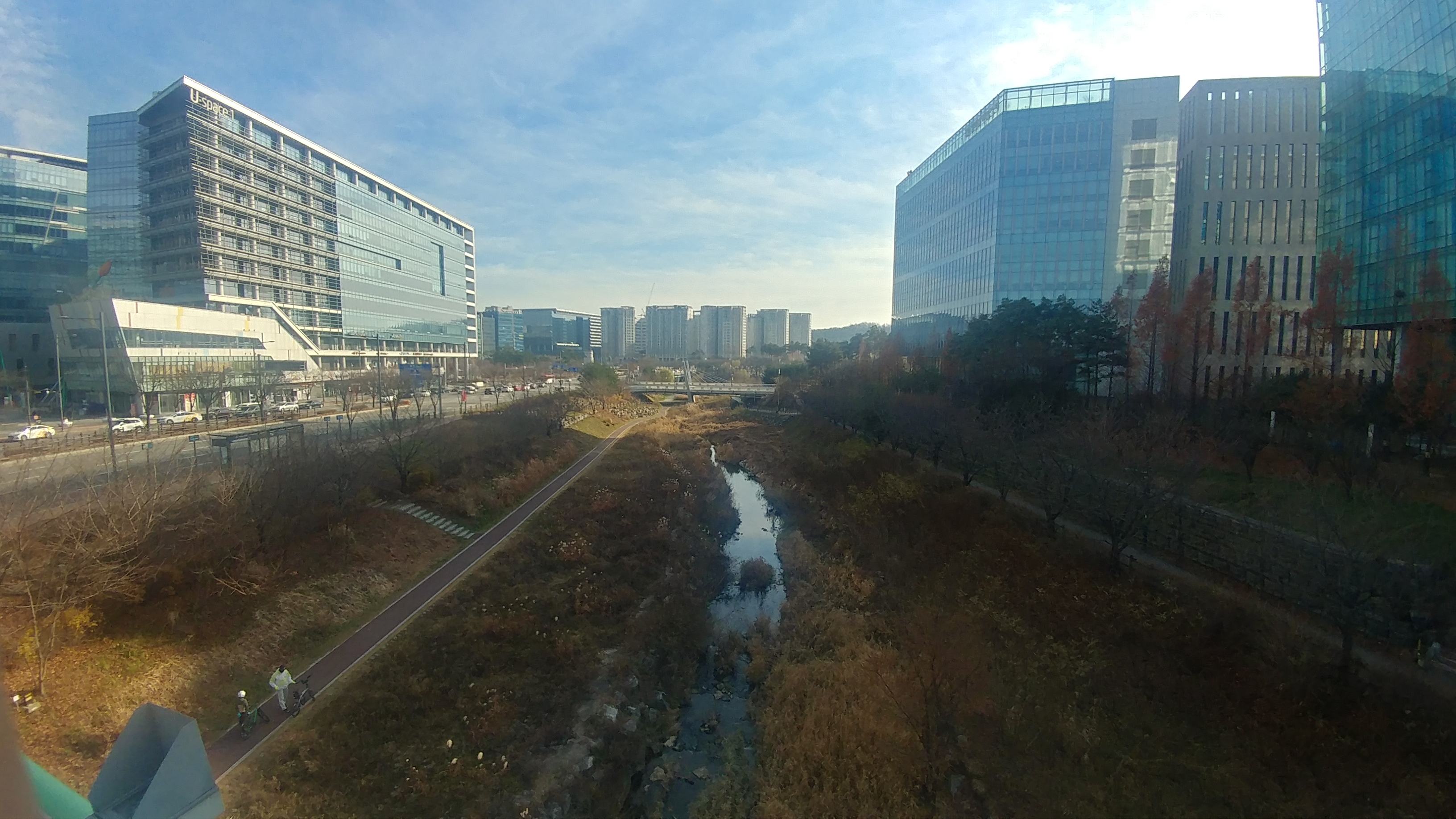 판교의 빌딩 숲 옆에 강가