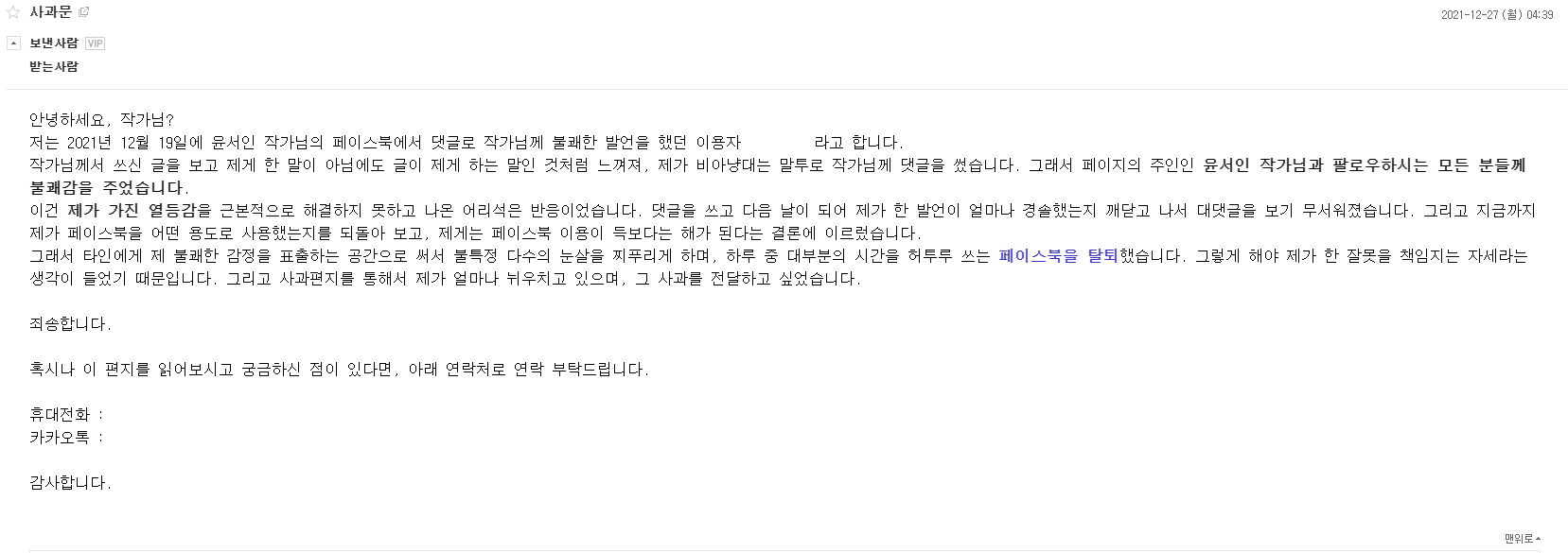 그래서 타인에게 제 불쾌한 감정을 표출하는 공간으로 써서 불특정 다수의 눈살을 찌푸리게 하며, 하루 중 대부분의 시간을 허투루 쓰는 페이스북을 탈퇴했습니다. 그렇게 해야 제가 한 잘못을 책임지는 자세라는 생각이 들었기 때문입니다. 그리고 사과편지를 통해서 제가 얼마나 뉘우치고 있으며, 그 사과를 전달하고 싶었습니다.